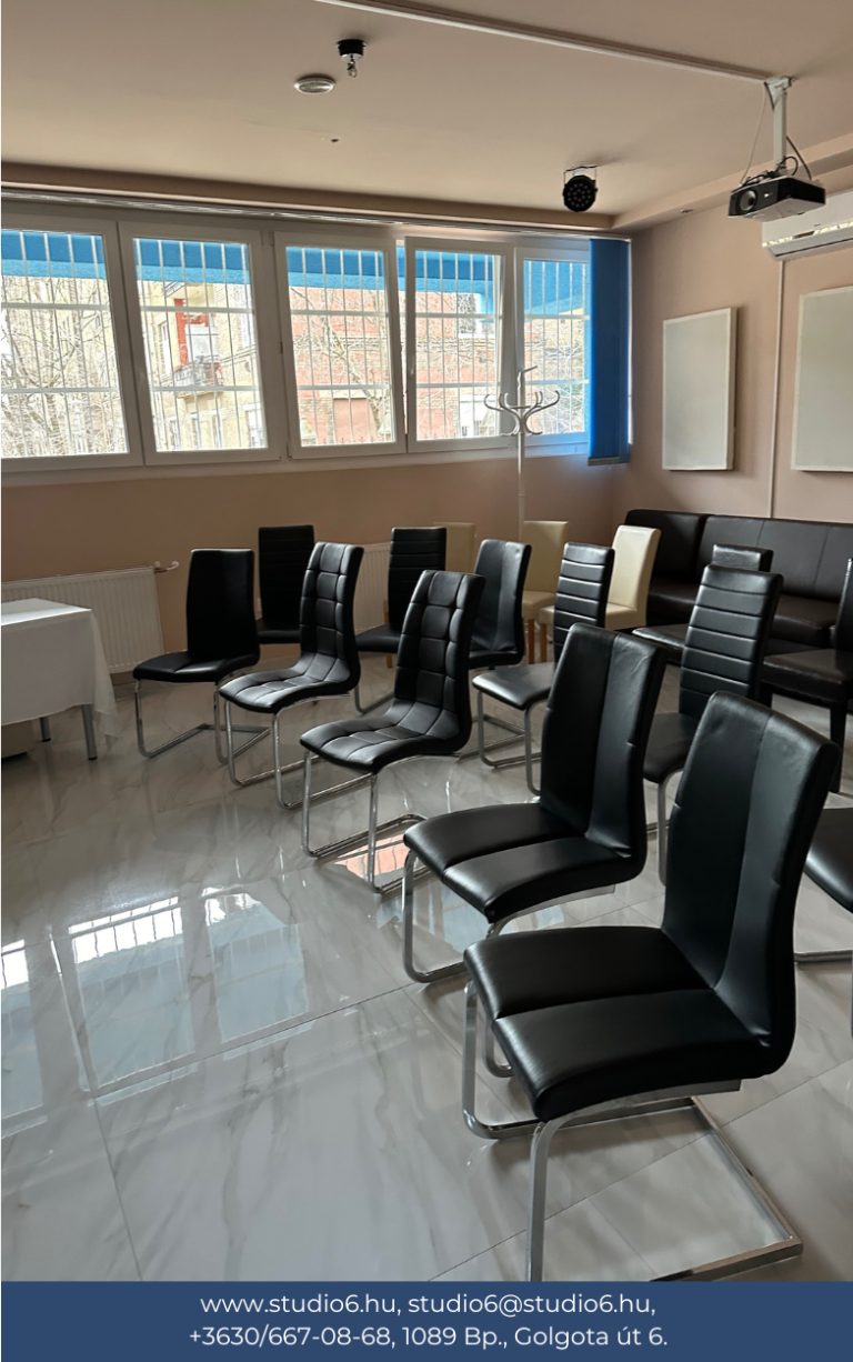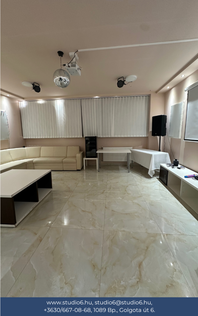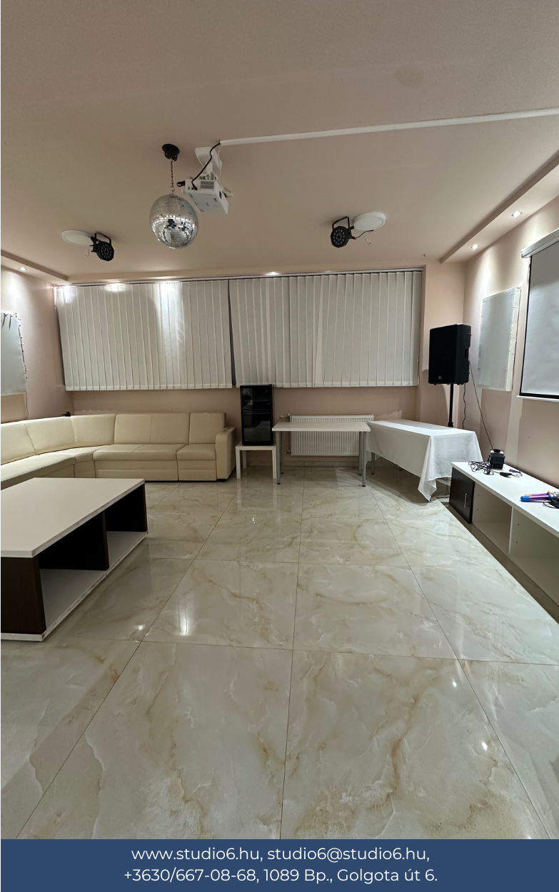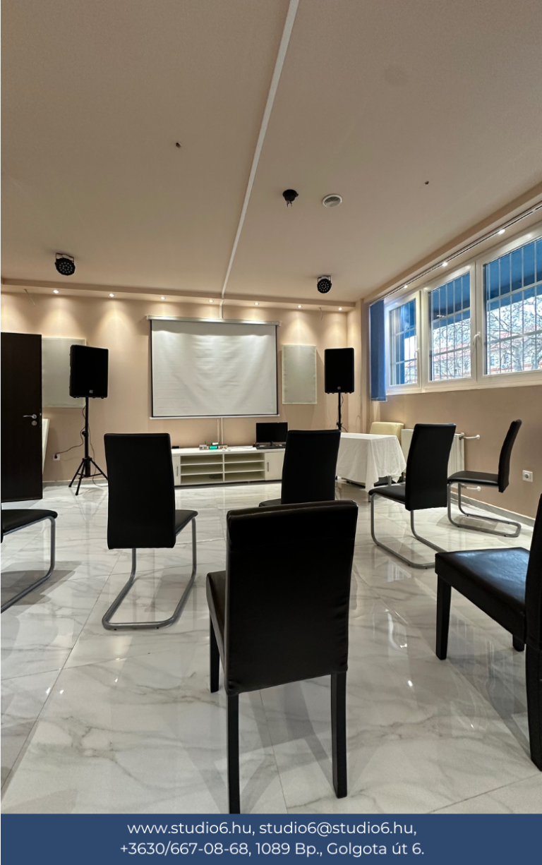 Válaszd a Studio 6-ot, mint rendezvényhelyszín és élvezd prémium szolgáltatásink, valamint igényes kialakításunk előnyeit! Minden szobánk projektorral, számítógéppel, hangfalakkal felszerelt. Továbbá van bennük hűtő és jéggép is. Berendezésük igényekhez mérten változtatható. Alap esetben székekkel és/vagy kanapéval kerültek kialakításra. Szükséged lenne egy írható táblára vagy extra asztalokra? Csak szólj és intézzük!
