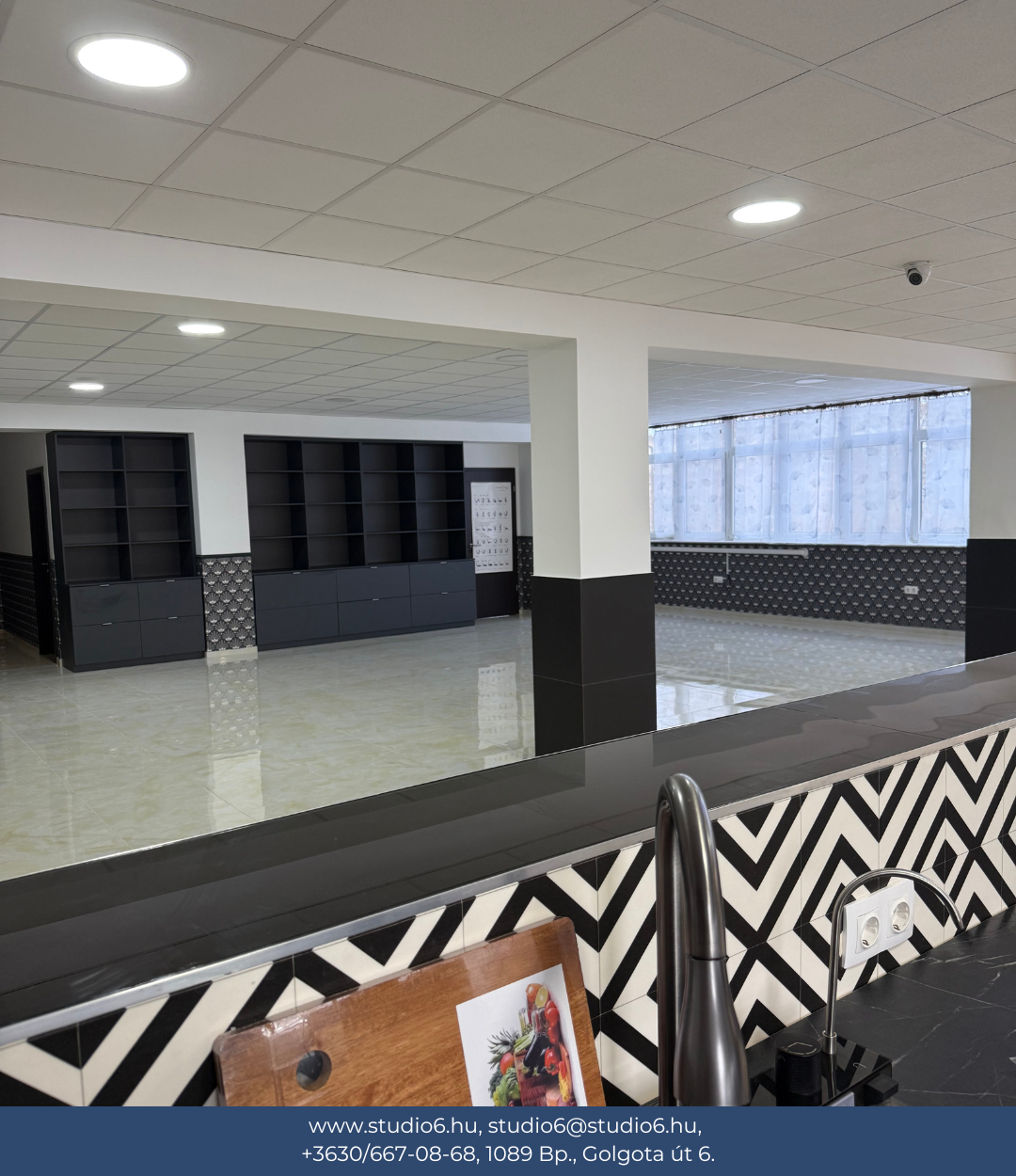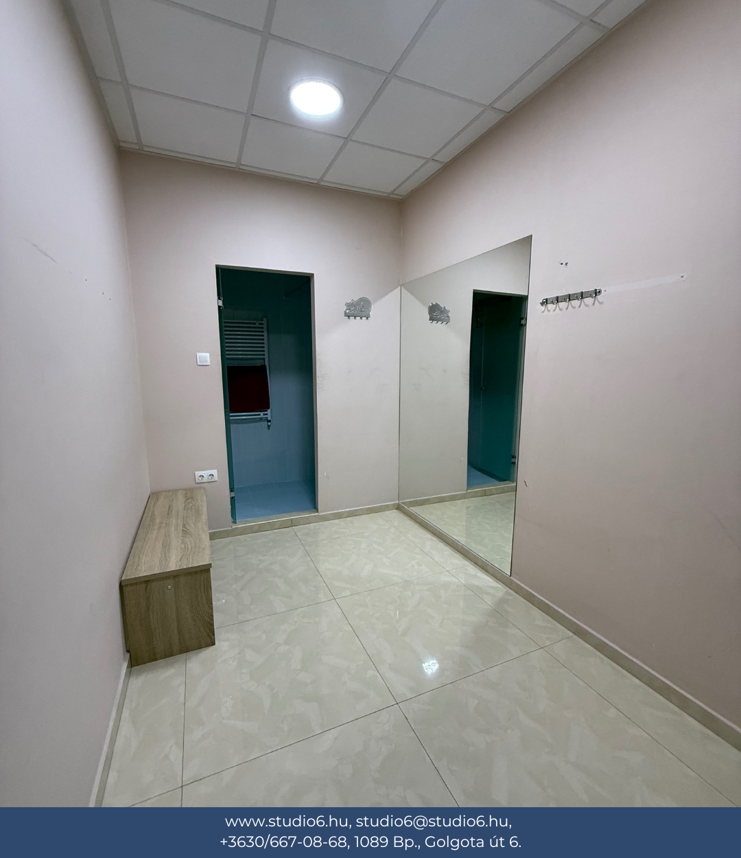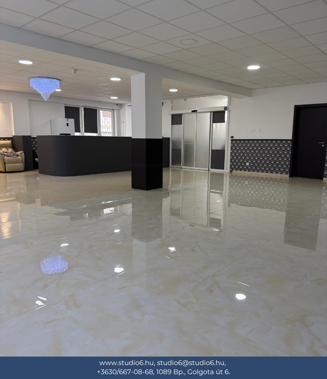 A bérelhető több, mint 200 négyzetméteres, klimatizált terünk az 1. emeleten helyezkedik el. A belső udvaron át kényelmesen megközelíthető. A lépcsőházból a mozgásérzékelős ajtón át jutunk be egy hatalmas járólapos térre, ahol jobbra a felszerelt teakonyha található, balra pedig a különböző célokat szolgáló szobák (mosdók, öltözők, pihenő, ruhatár, raktár, tárgyaló stb.) kaptak helyett. A legnagyobb nyílt réssz kb 140 négyzetméteres.