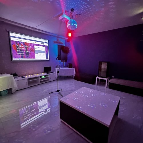 A 2. és 3. party szoba felszereltségükben és méretükben ugyanaz, elrendezésükben van kis eltérés. Most a 3 számú szobát olvasod, ezt a szobát azoknak ajánljuk, akiknek több ülő felületre és asztalra van szükségük vagy kevesebben vannak, míg a 2 számú szobát nagyobb társaságoknak, nagyobb tánctérre vágyó csapatoknak javasoljuk.